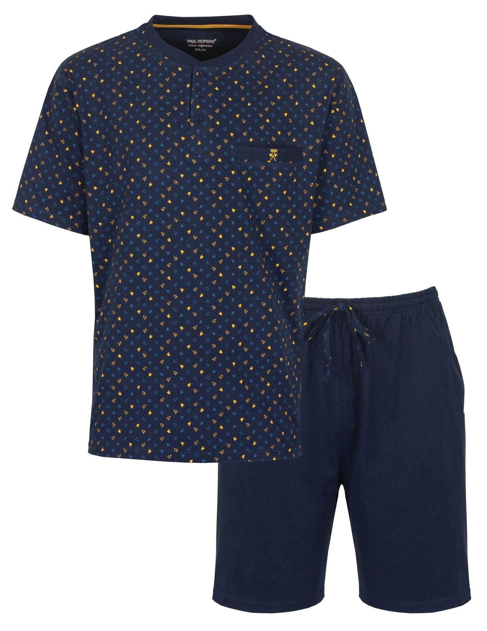 Paul Hopkins heren shortama gemaakt van 100 % gekamde katoen. Deze shortama is gemaakt in een draagbare en rekbare jersey kwaliteit. De top heeft een origineel geprint dessin. Ronde hals met een polo sluiting en knoopjes. Korte mouwen en op de borst een paspel borstzakje met een geborduurd logo. De korte unie broek heeft zakken in de zij naad met in de taille een aantrekkoord. Hals boordje met elasthan voor meer draagcomfort.